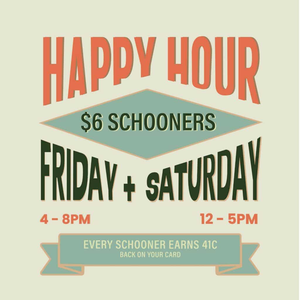 Available Fridays from 4-8pm & Saturdays 12-5pm. Plus every schooner earns you 41c back onto your members card!